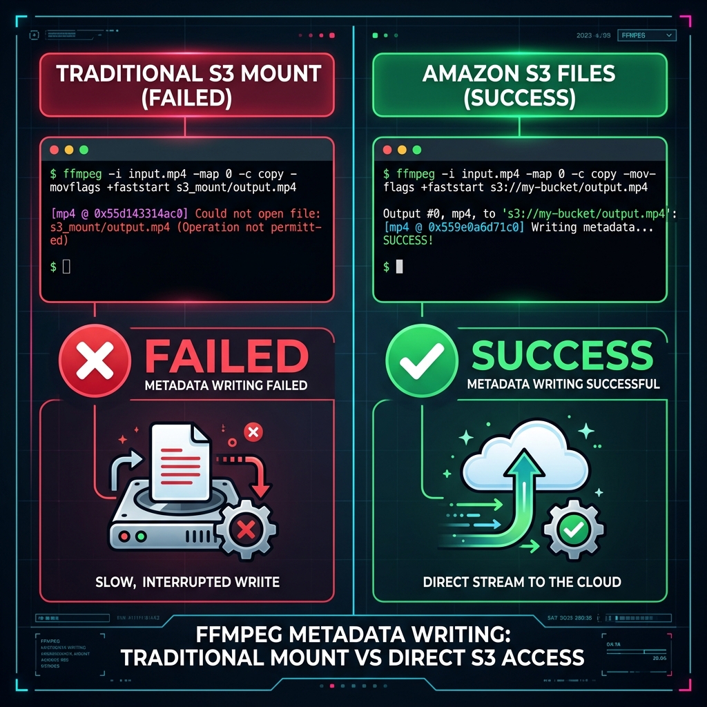 As seen in our tests, the traditional mount fails with a "Could not open file" error at the end of the process. S3 Files, however, handles the seek operation perfectly, completing the conversion with zero red text.