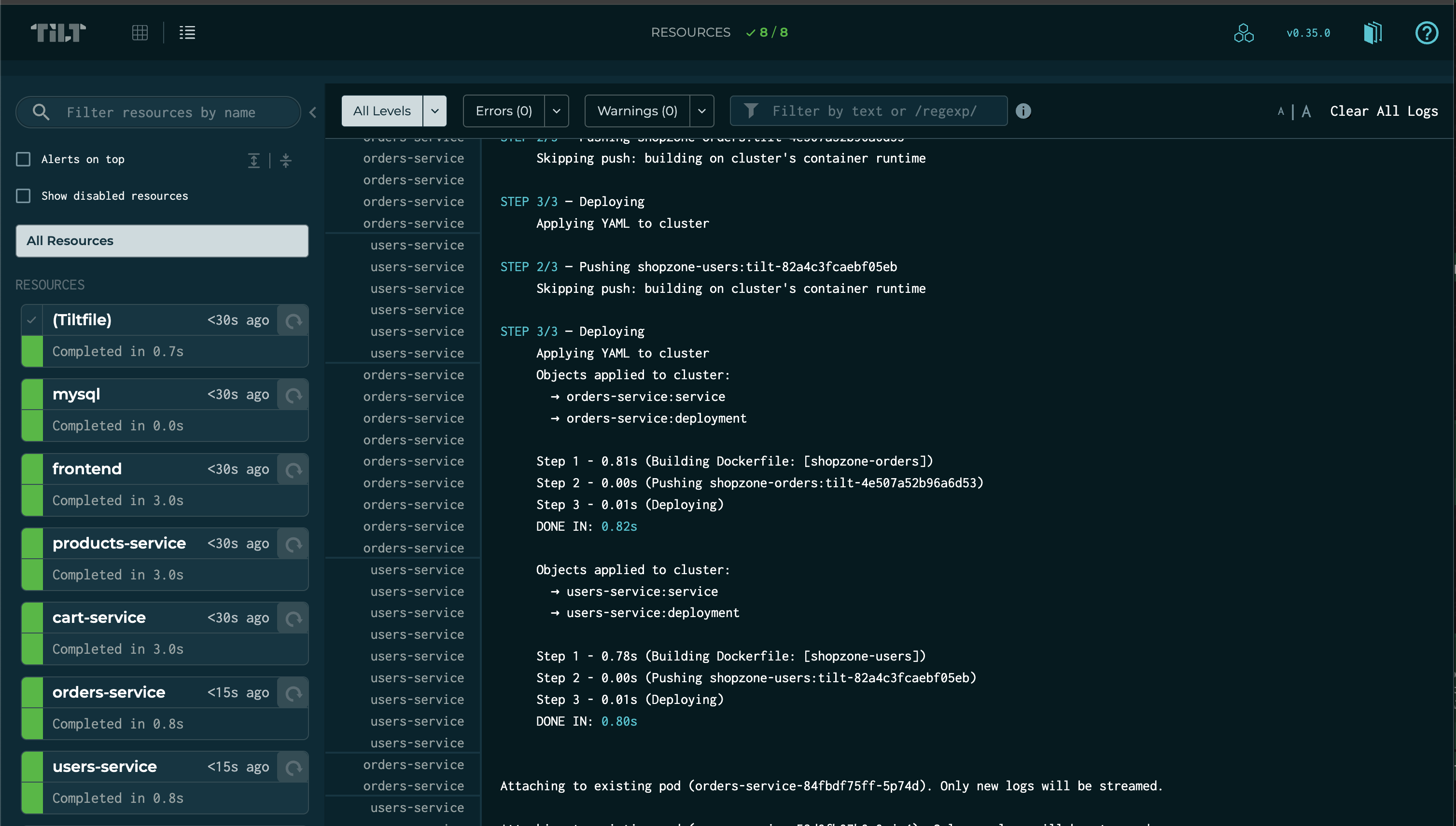 "Want to see Tilt in action? Check out the ShopZone E-commerce Store repository for a complete example of Tilt managing a real-world microservices application."