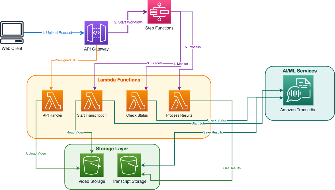 A serverless media transcription service built with AWS Lambda and Amazon Transcribe. This solution automatically processes audio files uploaded to S3, converts them to text using Amazon Transcribe, and stores the results back in S3. The architecture is event-driven, cost-effective, and scales automatically based on demand.